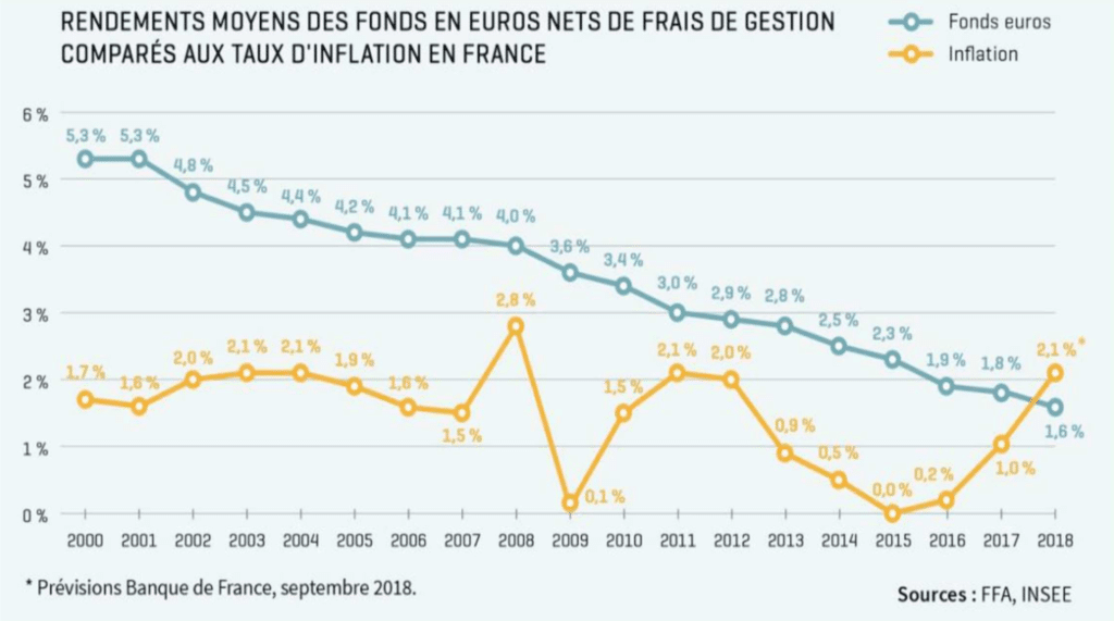 La rémunération de vos différents livrets et Fonds euros « classiques » étant étroitement corrélé aux taux d’emprunts, ceux-ci ne peuvent que chuter, d’où la baisse permanente du rendement de votre épargne.